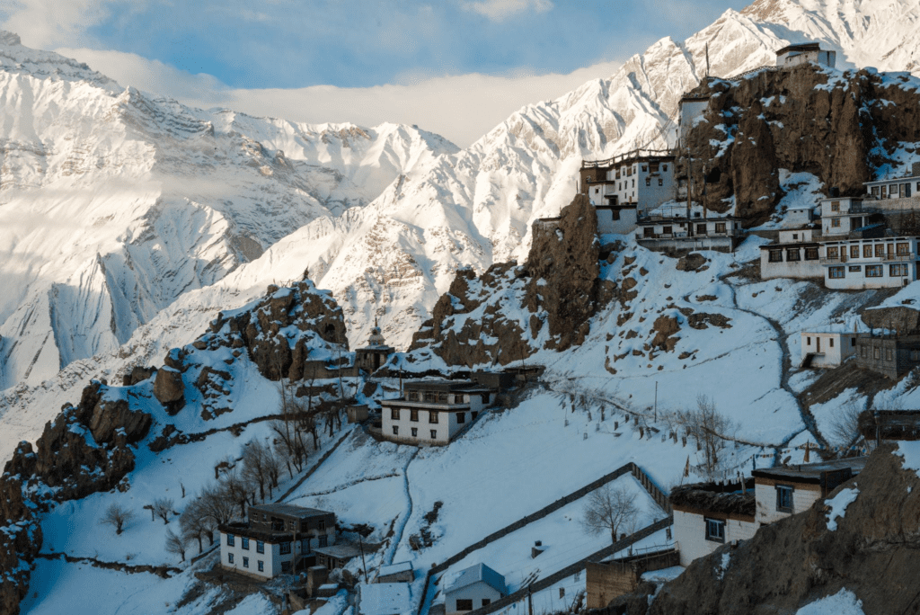 Spiti Valley in winter offers a raw and intense experience. Frozen rivers, snow-blanketed villages, and breathtaking white landscapes redefine the valley.